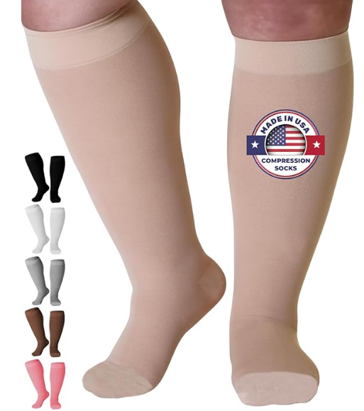 Mojo Knee High 20-30mmHg Compression. Comes in sizes up to a 32 inch calf, and has COLORS!