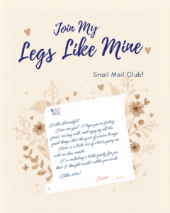 Remember the joy of finding something fun in your mailbox instead of another bill? That’s exactly the vibe of the LegsLikeMine Snail Mail Club! Each month, I’ll send out a little envelope of sunshine—complete with a handwritten (or at least hand-inspired!) letter and a small goody tucked inside. It might be a sticker, a magnet, a mini piece of art—something that makes you smile and reminds you that connection doesn’t always have to be digital.